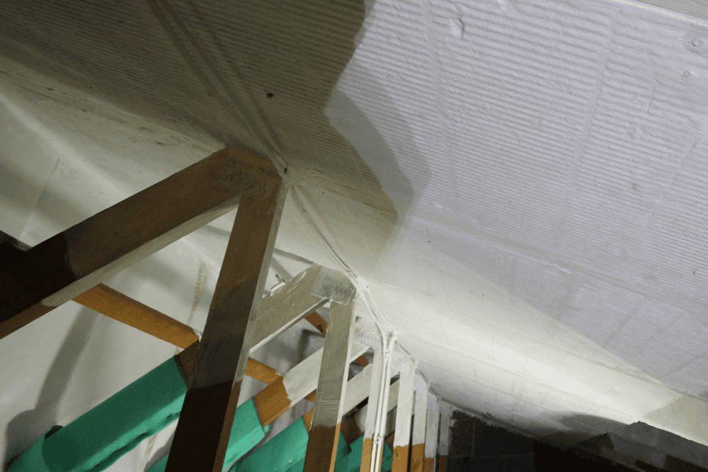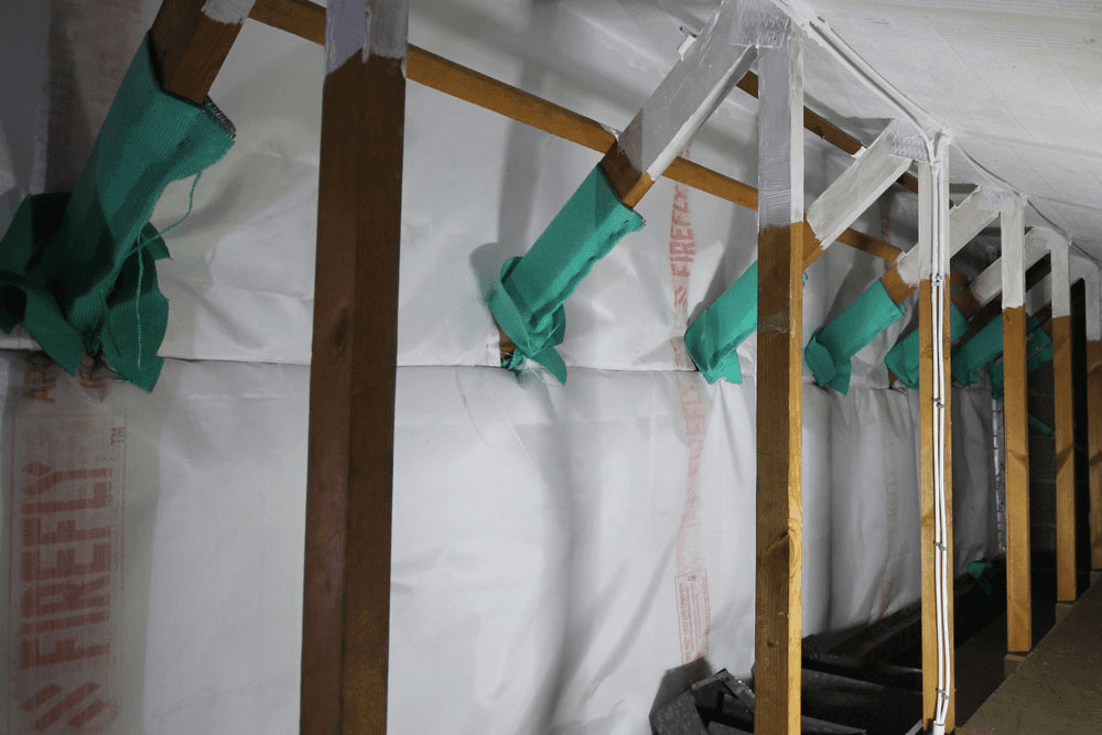 Timbers penetrating the barrier were protected using FIREFLY® Collaroll, and the surrounding timber rafters were coated with FIREFLY® Ablative Coating. FB180 Ablative Batts were friction-fitted between the rafters, with a 6mm bead of FIREFLY® FR Intumescent Acrylic applied between adjoining batts and at all junctions with the timbers - ensuring an effective fire-resistant seal and maintaining system integrity throughout the protected zone in accordance with Approved Document B.