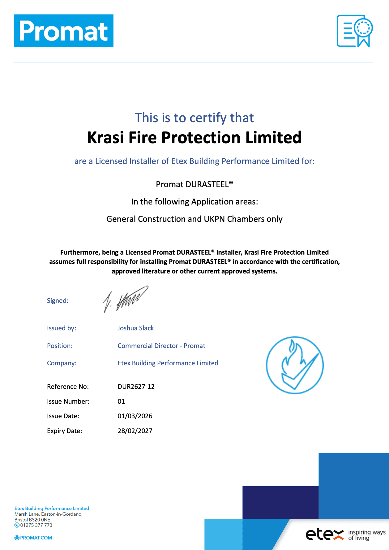 In a regulatory environment shaped by the Building Safety Act and heightened scrutiny around passive fire protection, having certified, traceable installation records is not optional — it is essential. DURASTEEL®, installed by a Promat-licensed contractor such as Krasi, provides exactly that assurance.